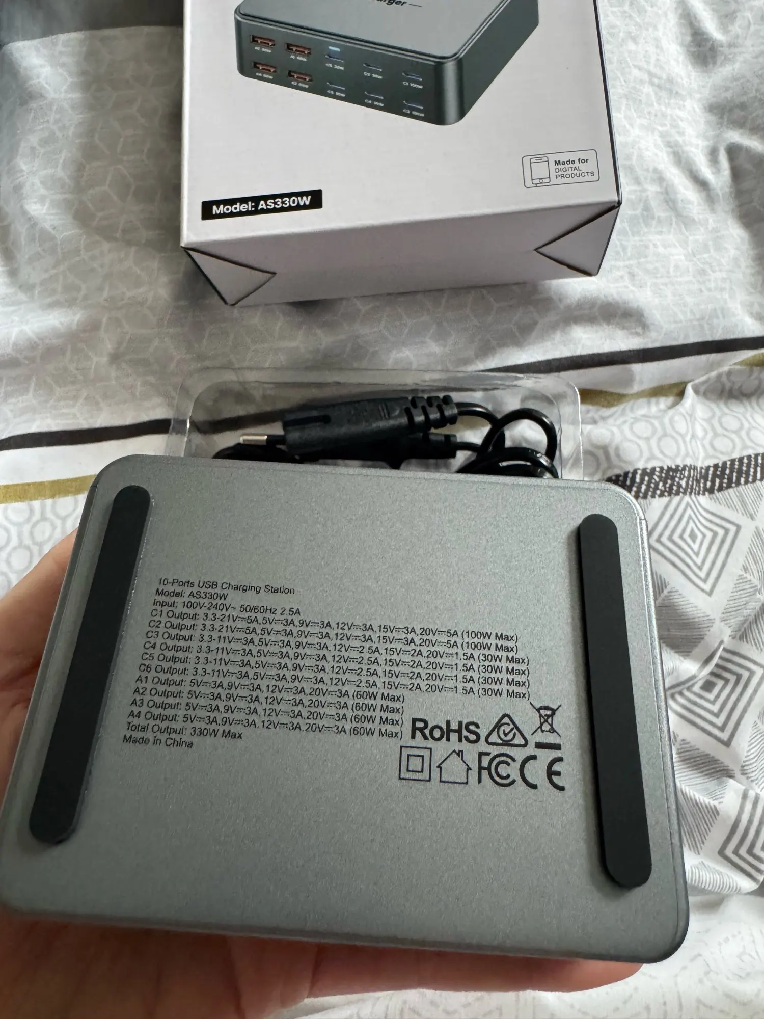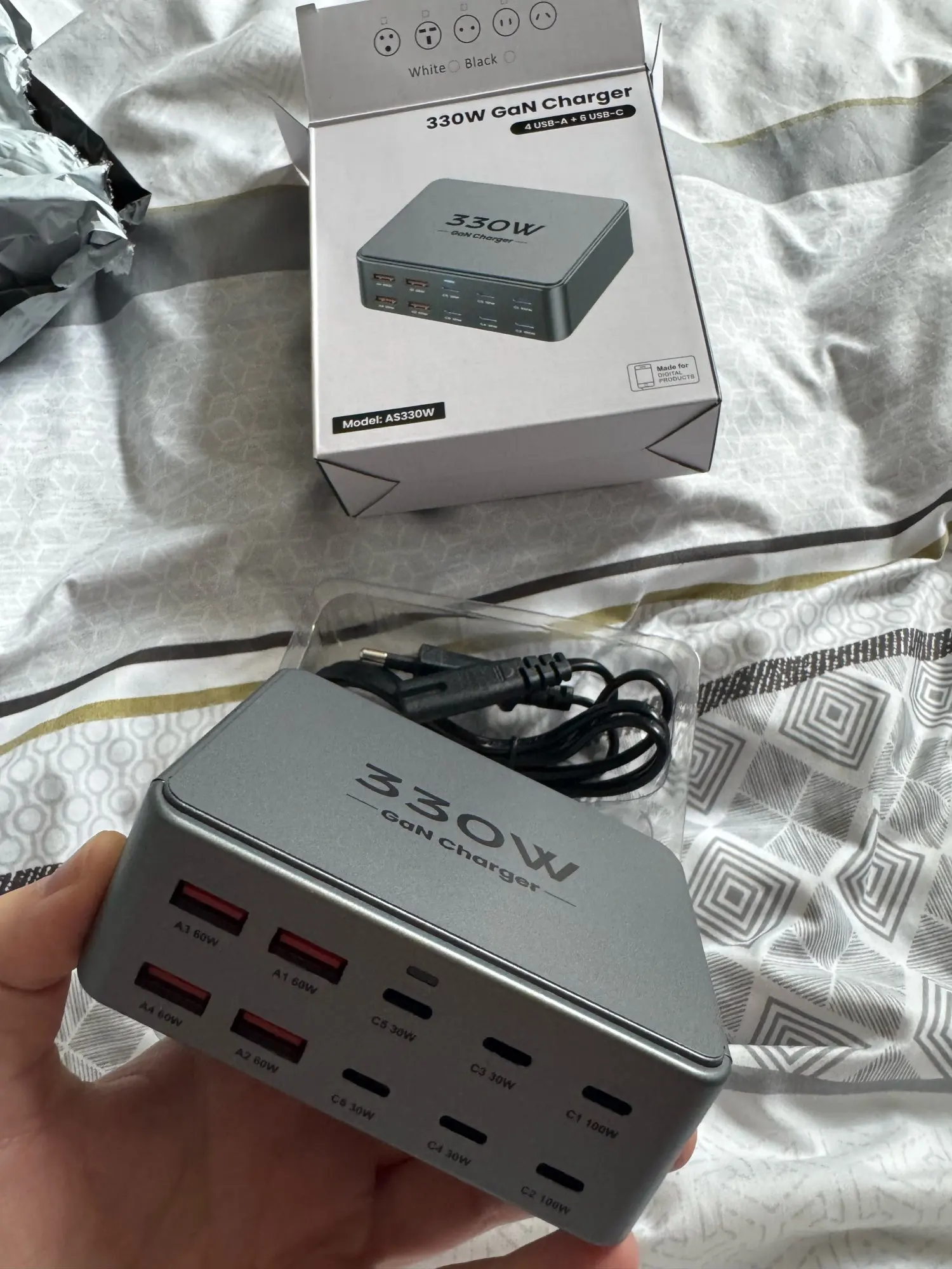It's a 330w charger, and I was worried because it was so cheap, but luckily it charges well. I should buy a few as gifts next time.